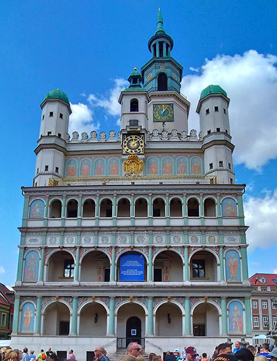 老城廣場四周都環有整排形式高矮不一、立面山牆各自迥異,多采多姿的建築,現為餐廳、酒吧、旅館與博物館等。據說每棟建築整建前都需先申請,經過核准後方可動工,以保留城市建築的特色。 除了色彩繽紛外,多棟建築外牆上還繪有特殊的花紋或圖騰,各自精采,讓人目不暇給。 市政廳&歷史博物館 (Ratusz w Poznaniu & Muzeum Historii Miasta Poznania) ,是老城廣場裡最顯眼的地標性建築。1939年以前一直是該市的行政大樓,目前是波茲南歷史博物館,是波茲南國家博物館的一個分館。該博物館展示了波茲南自西元11世紀至1945年的歷史。 波茲南的市政廳 (Ratusz) 初建於1253年,於波西米亞的瓦茨拉夫二世統治期間約 1300 年左右完成,並於 1310年首次以拉丁文記錄為「Domus Consulum」。原是一座建在凸起的四邊形上的單層哥特式建築。1536年,這座城市遭受了一場大火,對市政廳造成了嚴重破壞。1540- 1542 年進行了維修工作;1550年,政府決定聘請當時著名的義大利建築師喬瓦尼·巴蒂斯塔·迪·夸德羅 (Giovanni Battista di Quadro),以文藝復興式重新設計波茲南市政廳;1781年至1784年,在該市「善政委員會」的努力下,對建築物進行了重大改造,並獲得了今天的基本形式,在波茲南戰役 (1945 年) 中遭受重大破壞之後,1945-1954 年,市政廳再次重建恢復其典型的文藝復興風格,是中歐最具代表性的文藝復興時期建築之一 (資料引自維基百科) 。 市政廳的正面朝東,特點是裝飾華麗的三層拱廊,立面的壁畫繪有阿基米德、維特魯威、維吉爾、荷馬、查士丁尼一世、賀拉斯、斯巴達克以及哈爾摩狄奧斯和阿里斯托革頓等古代世界著名人物。一樓的拱廊柱子之間有五對女性人物,則有成對代表耐心、謹慎、慈善、正義、信心、盼望、勇氣、節制等美德的女性形象。。最後一對是古代世界的兩位著名女性:Lucretia ( Lucrecia ) 的胸膛上插著長矛,而Cleopatra ( Cleapairi ) 的手臂上纏著蛇。