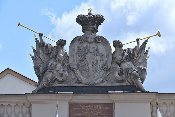 閣樓上陳列有從雅蓋沃和雅德維加到西吉斯蒙德二世的雅蓋洛王朝統治者畫像;後方最高處的古典風格塔樓端立有一隻二公尺長的白色展翼老鷹。在閣樓正中間小塔上面的時鐘下有皇冠圖騰,圖騰中的是字母組合的斯坦尼斯瓦夫·奧古斯都二世 (Stanisław II Augustus) 的縮寫「SAR」,時鐘上方有扇鐵門,每天中午12時,小門會打開,出來兩隻金屬山羊相互撞擊羊角12次 (資料引自維基百科) 。  | | 市政廳立面局部特寫。 |  | 臨近中午12點,市政廳前方已經匯集人山人海,等待山羊撞角的出現。 中午12點正,塔樓時鐘上方的鐵門緩緩打開,兩隻金屬山羊出來隨著鐘聲點頭互相撞角12次,過程約5分鐘;一開始還算是有趣,後面持續重複的動作就顯得有點無聊了。