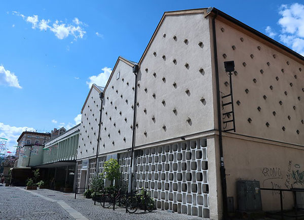 樣式簡樸的路燈,燈柱上有個鏤空皇冠標誌牌,代表此地被波蘭國家文物局列為「國家歷史古蹟」。 市政廳旁邊這排五顏六色帶拱形走廊的房屋為「商人之屋 (Merchants Houses /Domki Budnicze) 」,16世紀時工匠、蠟燭商人和鹽商做生意的地方;在早期文藝復興建築的拱廊中,曾經做過過魚、蠟燭、火炬和鹽等買賣,因此舊名稱為「鯡魚窩 (Budy śledziowe) 」。 這排色彩繽紛的商店門面既高且狹窄,據說當時店主們需要根據房子的寬度交稅,所以早就想出了這種奇特的建築結構來應付政府的稅收政策。二次世界大戰期間這些屋舍幾乎被完全摧毀,戰後 (1953-1961年) 重建為現今美麗多彩的樣貌。