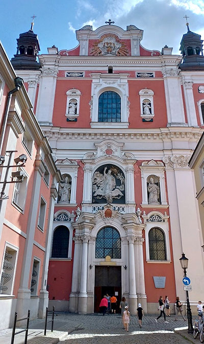 永援聖母暨瑪莉亞瑪達肋納聖殿教堂 (Fara Poznańska/Fara Church) ,位在波茲南老城廣場附近向南的小巷中,粉白色調宏大的巴洛克建築讓人眼睛為之一亮。教堂前小巷太窄,難以拍到正向全面的角度。