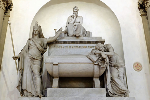 比起伽利略不全的屍骨,但丁在「聖十字殿」裡的豪華大墓就更奇特了,因為它根本就是一座空房子!但丁因為捲入佛羅倫斯的政治一度被以異議人士被判死罪而流亡到在北義的拉溫納Ravenna去。他死後也就葬在拉溫納的Basilica of San Francesco教堂裡。佛羅倫斯對於這個名人被人家搶去當然不甘心,之後的數百年一直想把他的屍骨運回佛羅倫斯改葬,但是一直不能如願。拉溫納的Basilica of San Francesco教堂為了怕佛羅倫斯來搶屍甚至還一度把但丁的屍骨藏到牆裡去!佛羅倫斯最後雖然沒能搶回但丁的屍骨,但是還是不甘示弱地於1829年在「聖十字殿」裡為但丁蓋了一座豪華的陵寢,只不過陵寢至今仍然是空的。無獨有偶地,出名的「白衣天使」南丁格爾Florence Nightingale (1820年-1910年)也出生於佛羅倫斯。她死後也是葬於英國,但是在「聖十字殿」的迴廊裡也有一座她的紀念碑。