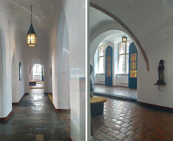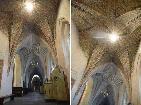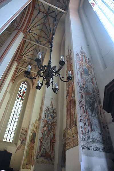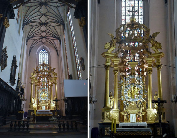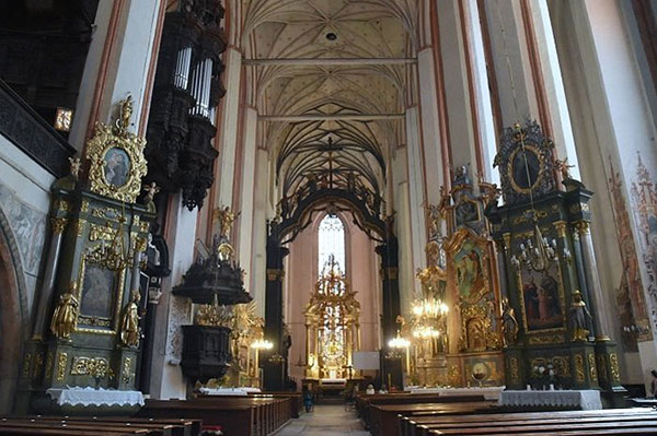 | | 聖母瑪利亞教堂之中庭。 |  | | 美麗的穹頂彩繪。 |  | | 中央走道覆蓋著恆星的拱頂高有26.75公尺。 | 聖母瑪利亞教堂中不僅有展現14世紀獨特雕刻技藝的哥德式牧師座,也有具有文藝復興特色的墓志銘,二者毫無違和感的共存體現了托倫包容四方的文化胸懷,也是波蘭乃至整個東歐世界宗教建築的奇葩之一。