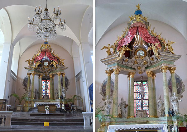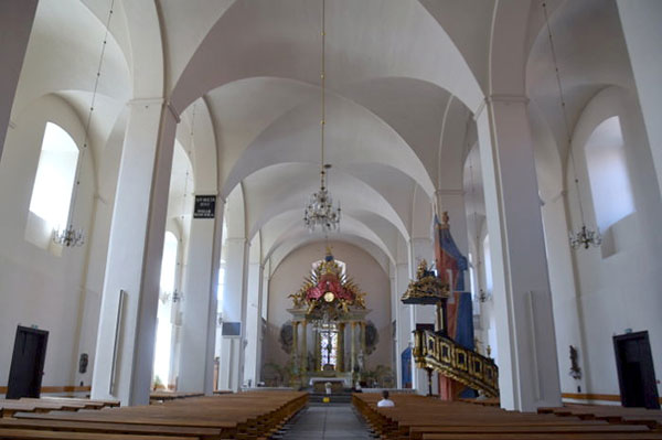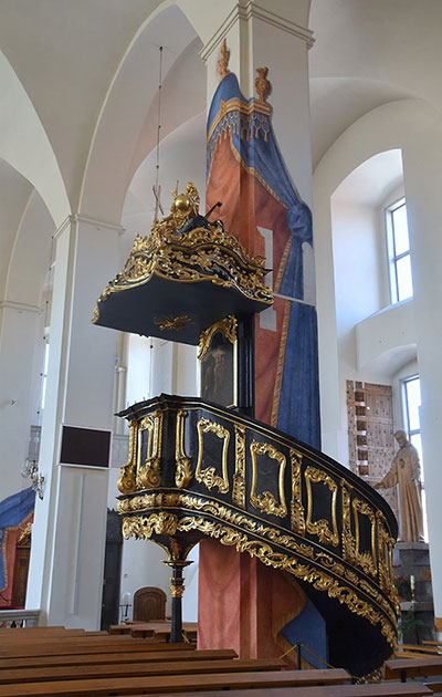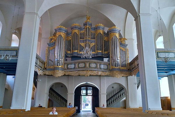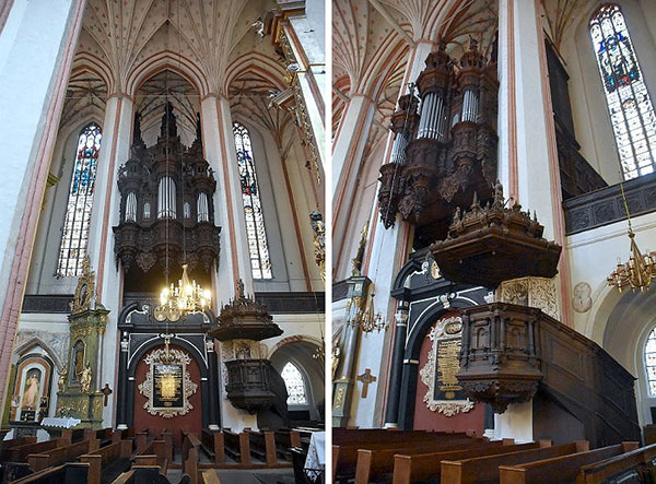 | | 教堂牆邊有幾扇不知作用的美麗木門。 |  | 華麗的洛可可樣式管風琴 (Organ) 是1989年之後重建。