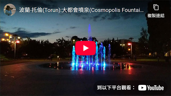 大都會噴泉 (Cosmopolis Fountain) ,由當地藝術家 Zbigniew Mikielewicz 引用尼古拉·哥白尼的著名著作《論天球的運轉》為靈感所設計,夜間有水舞表演,從 21:00 開始,午夜結束。 文章出處:https://blog.udn.com/kocj/164431585 |
