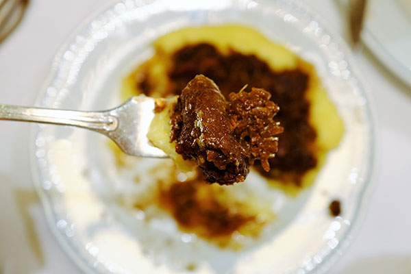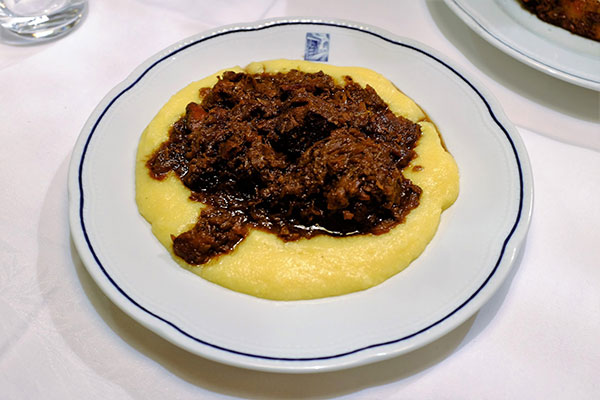 Stewed wild boar with polenta:燉野豬和波倫塔玉米糊。