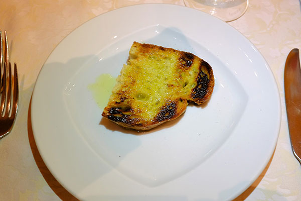 裡面的樣子。蠻大的一家餐廳,分了好幾區。這區應該是英文區,義大利的餐廳通常會把講英文的顧客集中在一區,這不是什麼種族歧視,而是這樣子的話它們可以讓會講英文的服務生一起服務,其實也是蠻有道理的安排。 送的麵包很有誠意,在火上烤過的,而且端上桌的時候橄欖油就直接這樣很大器地給它澆下去。
