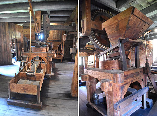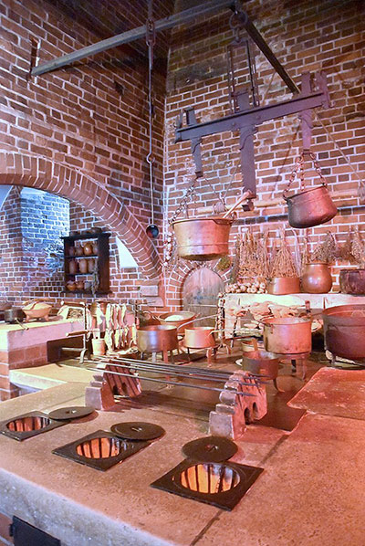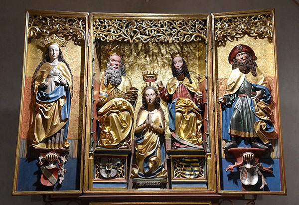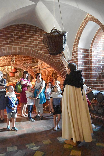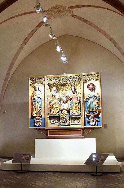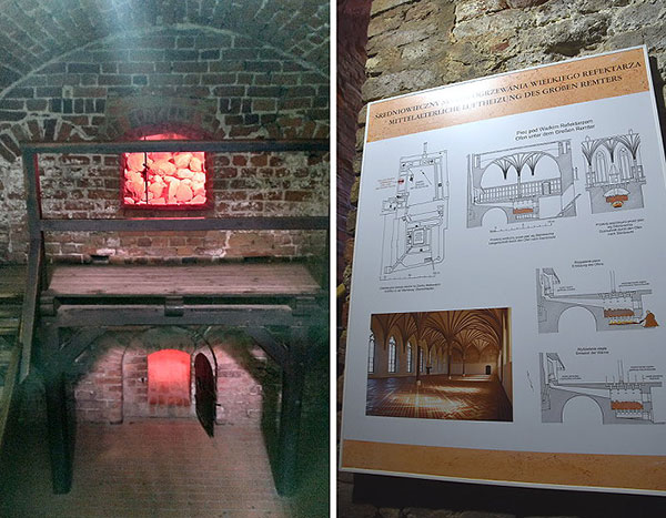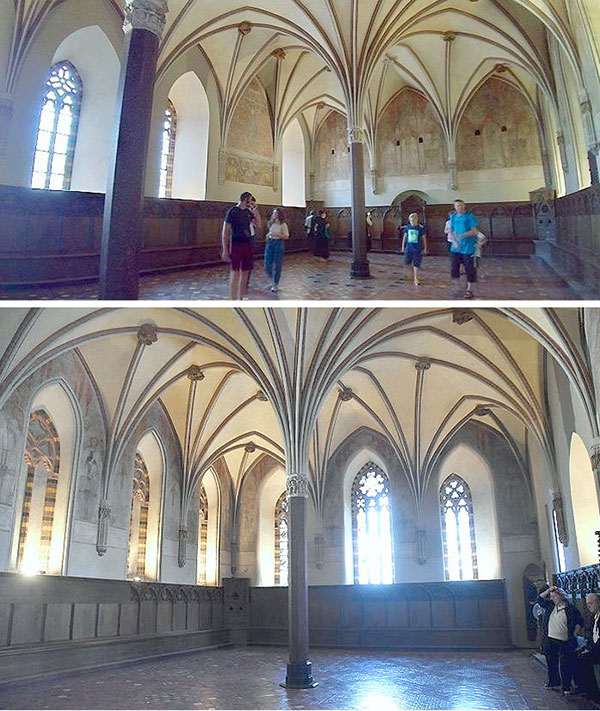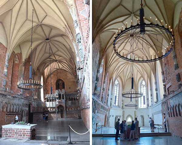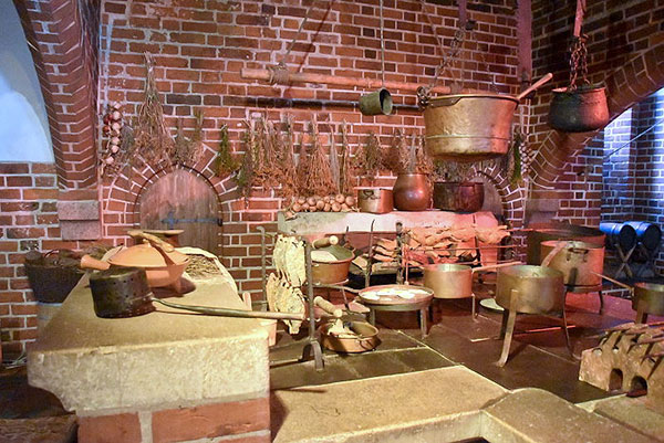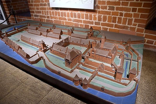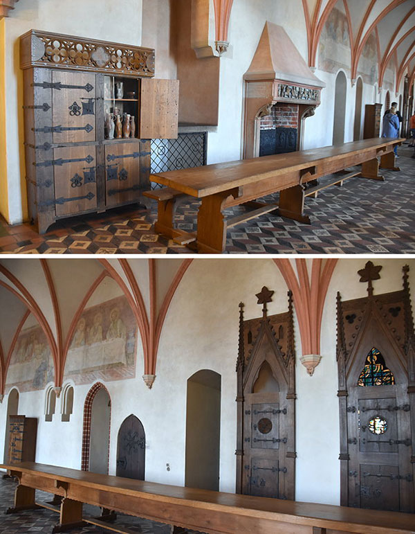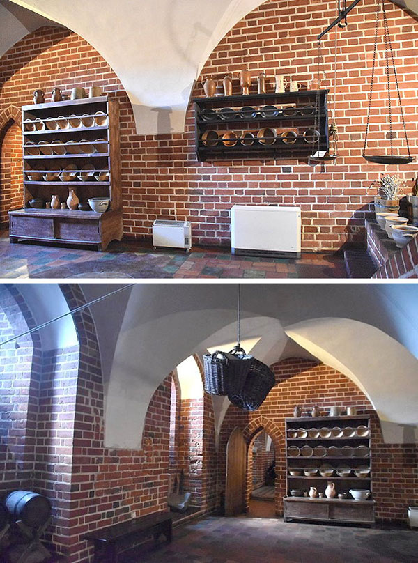 | | 再回到高城堡二樓。 |  | 位於二樓的騎士住宿區與起居室。起居室內,通過復原當年的各式家具,讓人得以了解騎士們的日常起居活動。 歐洲中世紀騎士的床都很窄很短,據說是因為其實在中世紀、甚至到了18~19世紀,大部分歐洲人都是半躺而不是全躺平睡覺的,他們認為這樣更利於身體健康。 這間有著精緻的門板,推測可能是騎士團大團長的房間。 來到高城堡一樓,這裡採用的羅馬式拱頂形式,粗重簡單,拱頂低矮,牆壁厚重,室內明顯昏暗。 這座原置放於聖瑪利亞教堂東側精美的三聯式木雕主祭壇,製作於1504年,描繪了聖母瑪利亞的形象,三聯祭壇兩側的人物則分別是聖芭芭拉和聖雅各。 另一座頗有年份的三聯式木雕祭壇,主題為聖母抱子。 廚房位在一樓,現今城堡裡所有廚具都是還原中世紀的樣式。 廚房內擺放滿了各種食物模型,還原了中世紀的餐飲樣貌。 巨大的齒輪組。據說當時的騎士團發明了一種功能上來說類比為起重機一樣的機器,這樣一來下面廚房的飯菜就得以傳送上來,他們也就不必因為傳送飯菜而耗時耗力了,可以看出中世紀的人們為便利生活所做出的設計(資料引自網路)。  | | 對機具的運用令人嘆為觀止。 |  | 很多木造機具,看起來與東方農業國家機具類似,有異曲同工之妙。