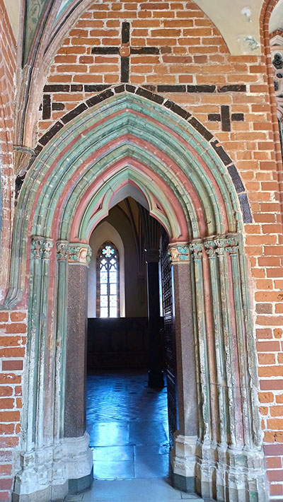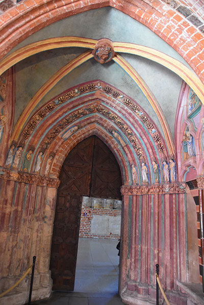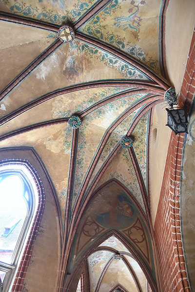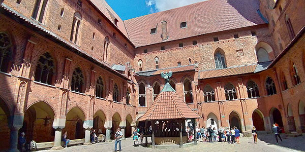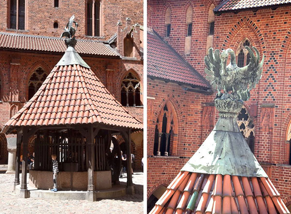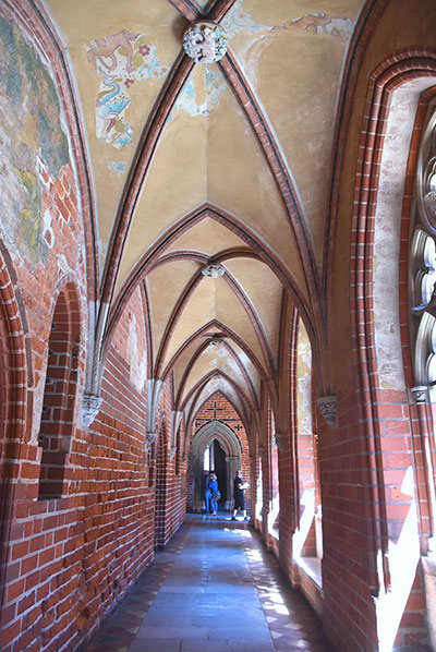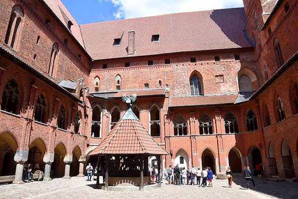 | | 高城堡的外圈的壕溝,原是已乾涸之護城河。 |  | | 俯瞰高城堡通往外城部分。 |  | 高城堡吊橋連接中城堡的面向。據說中世紀時,前往高城堡的這扇大門和吊橋通常是關閉著的,要進入高堡區還必須使用正確之通行密語。  | | 以當時的投石來做裝飾,頗有趣味。 |  | | 矮棚放置以前殘存的建築零件。 |  | | 高堡區四方迴廊中庭裡有一口巨大的水井。 |  | 這口井是城堡供水的唯一源頭,為了防止敵人向井水中投毒,水井外圍安裝有一圈防禦性的鐵柵欄。立在水井亭上的石雕是一隻用自己胸口獻血餵養小鳥的鵜鶘,據說這座雕塑象徵著條頓騎士為了繁衍與生生不息可以奉獻一切。  | | 選一道門進入高城堡二樓。 |  | 高城堡的四翼由環形走廊連接,一系列連拱廊環繞庭院一圈。  | | 自二樓迴廊窗格俯瞰中庭。 |  | | 迴廊上裝有漂亮的哥德式花飾窗格。 |  |  | 二樓迴廊每一座拱頂都有美麗的彩繪與雕飾做裝飾。  | | 圓形雕飾的圖案皆迥異,極富觀賞之趣。 |  |  | | 教士會堂紅綠相間的尖拱門。 |  | 教士會堂(Chapter House),內部由花崗岩立柱支撐起的拱頂,輻射狀的拱肋從立柱頂部向四周均勻散開,如同傘蓋一般。 教士會堂四周環繞一圈由櫟木製成的長凳,供騎士教友聚會時使用。舉行盛大議會時,騎士團團長、國家重要權貴及各地代表會齊聚會堂,探討和制定政治、經濟和法律等方面的議題。騎士團團長會坐在會堂正中最尊貴的上位大座椅主持議會。 會堂中的壁畫,描繪有天使長米迦勒、耶穌受難和騎士團團長肖像等主題。 門廳上的「聖母與聖子」壁畫,運用多處的金色塗料裝飾,以彰顯對聖母瑪利亞的尊崇。 聖瑪利亞教堂的入口大門被稱為「金門(Golden Gate)」。 金門其上的浮雕裝飾製作於13世紀,是由黏土燒制雕刻而成,具有中世紀造形特徵的拙趣,表面還加以彩繪,雖然有歲月的斑駁痕跡,但仍可看出色彩繽紛鮮麗。 聖瑪利亞教堂(The Church of St. Mary),是城堡修道院的精神中心,教堂內部空間成長方形的巴西利卡式,可以容納數量龐大的朝聖人群,是條頓騎士團國內最大的教堂。  | | 教堂內的佈道壇,頂部宛若王冠般的造型。 |  | 聖母瑪利亞教堂二次世界大戰中遭到破壞,修復的工程浩大,是城堡修復工作最後竣工的地方。教堂還能看到不少斷頭缺手的雕像,據說這是特別留下來,為了讓大家看到戰爭為波蘭乃至全人類帶來的傷害,而維持著部分被毀壞的模樣,展現歷史的一部分。 壁面佈滿了歲月與戰火的痕跡,可以想見戰時滿目瘡痍的慘況。 聖母瑪利亞教堂的牆上有大量精彩雅致的壁畫,雖然修部後仍見斑駁或殘缺,卻真實的呈現14世紀的風貌。 第三樓層的外牆與水槽壁面,青花瓷的藍白色調極為特出醒目,其上的圖案都各有故事。