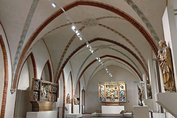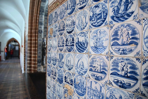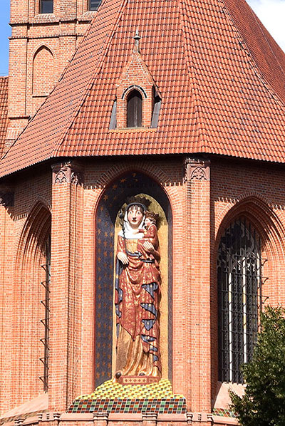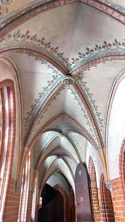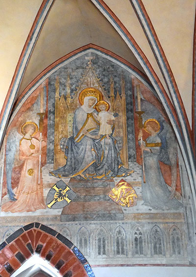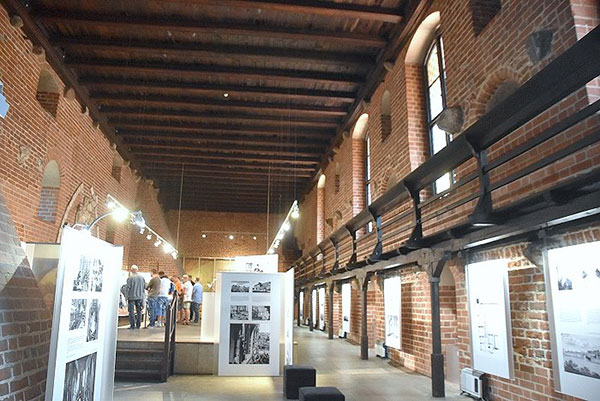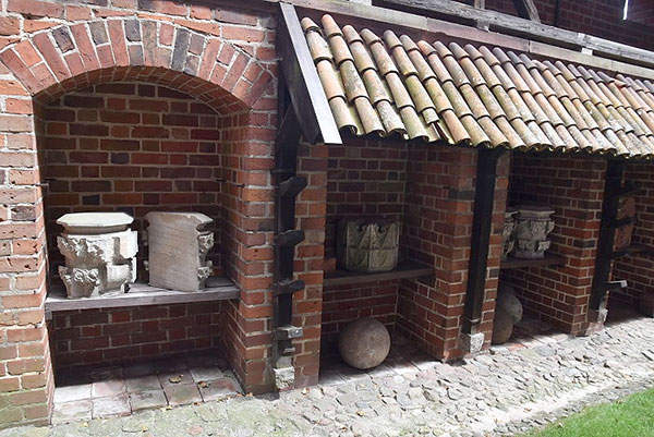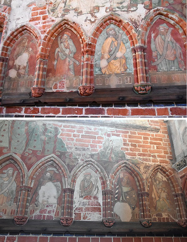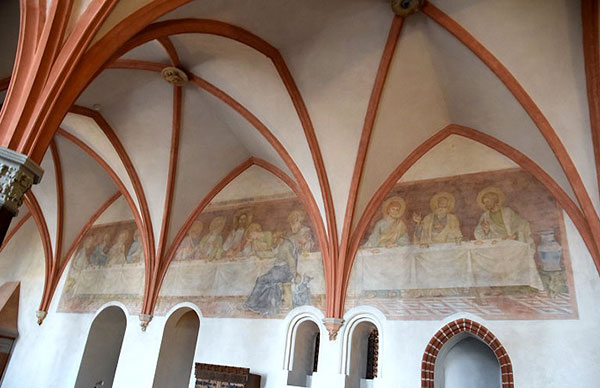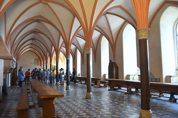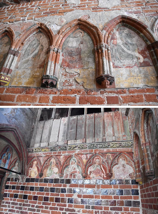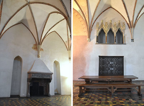 | | 食堂牆上有「最後的晚餐」壁畫。 |  | | 食堂供暖火爐與特別座區。 |  | | 文物史料展覽廳。 |  | 聖瑪利亞教堂的八角塔樓壁龕中的聖母抱子馬賽克鑲嵌雕像毀於二戰中,戰後根據先前的影像和圖文資料完整復原,這裡展有修復過程的相關細節資料。 聖瑪利亞教堂八角塔樓壁龕中重新修復還原的聖母抱子雕像。 從高城堡行經這道長廊,會通往「但斯克塔樓(Dansker Tower)」。 但斯克塔樓(Dansker Tower)外觀,高城堡透過高樓層的天橋(圖左方那棟)銜接但斯克塔樓。 但斯克塔樓(Dansker Tower)內部,展示三間當時的木造便所,這座塔樓既是公共便所又具防禦功用,當時的人在如廁時,排泄物會直接從高處掉下謢城河裡。