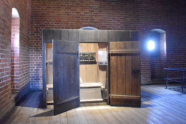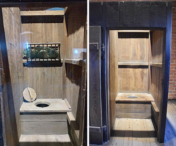 | | 左邊這間架上還置放了擦拭用的乾草葉。 |  | 出糞式座坑直通城樓底部如今已經乾涸的護城河,高度超過6層樓。