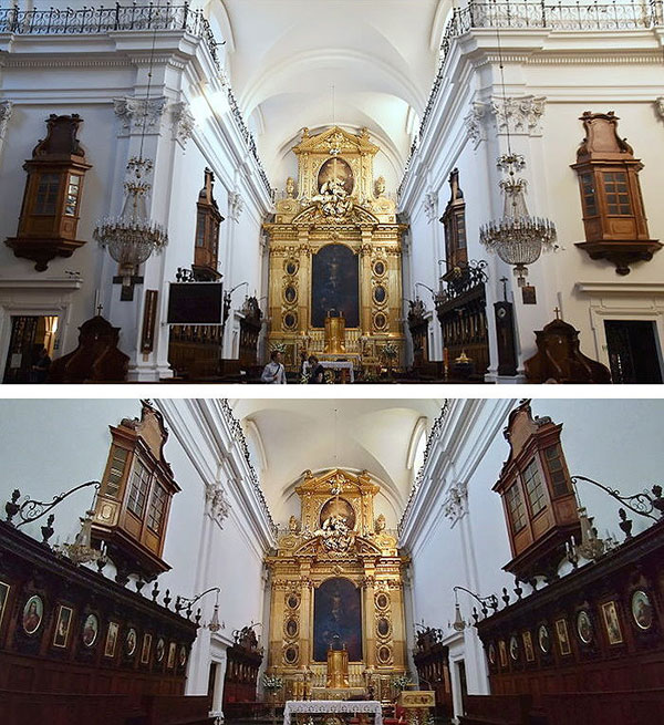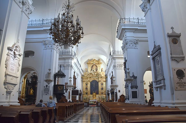 聖十字教堂正門。十幾年前跟團首度到此處,記得前方有男性團員一進門就被站在門邊的神職人員嚴厲斥喝,聲量之大語氣之惡,連我們走在後方的一行人都被嚇粉大,因他是用波蘭語兇人,當時大夥兒都一頭霧水,一旁有其他西方人指指團員頭上的帽子,這才恍然大悟,原來他忘了脫帽──當時這風波著實難忘!以致於後來CJ參觀教堂時都會特別留意要事先脫帽,但也發現不是所有教堂都這麼嚴格要求。這回再度前來,門邊則沒站任何神職人員。 聖十字教堂正殿,教堂裡寬大的正偏三殿間以八棱列柱,列柱上飛起大跨度的雙沿尖頂連拱。穹頂完全留白,以巴洛克式的天主教堂而言算是非常「樸素」;祭壇兩邊、左右翼各連著一個禮拜堂,最特別的是沿行道旁每支白色柱子或壁面置有大量名人墓碑或紀念碑,圖中左方有人觀看的柱子即是蕭邦心歸之處。  | | 主祭壇與前方木製唱詩座。 |  | | 金碧輝煌的主祭壇是1960年至1972年重建。 |  | 教堂內二側有多座巴洛克風格的拜龕供人禮拜,每座龕上金燦的雕刻及聖像,照得整個教堂光輝燦爛(僅po出4座代表)。