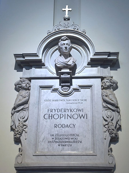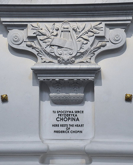 蕭邦於39歲英年早逝,1849年他在臨終時表達:「請在我的墳墓上撒下祖國的一把土,並將我的心臟永遠葬於祖國。」他的大姐露德薇卡(Ludwika)躲過俄國衛兵駐守的波蘭邊境(當時受俄國統治),偷偷把將蕭邦的心臟帶回祖國,並存放在華沙的聖十字教堂內。1882年裝有蕭邦的心的臟密封罐被封入這根柱子裡。而他的遺體其餘部分則葬在巴黎的拉雪茲神父公墓 (Pere Lachaise Cemetery) 中。
