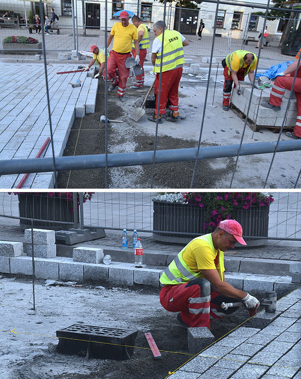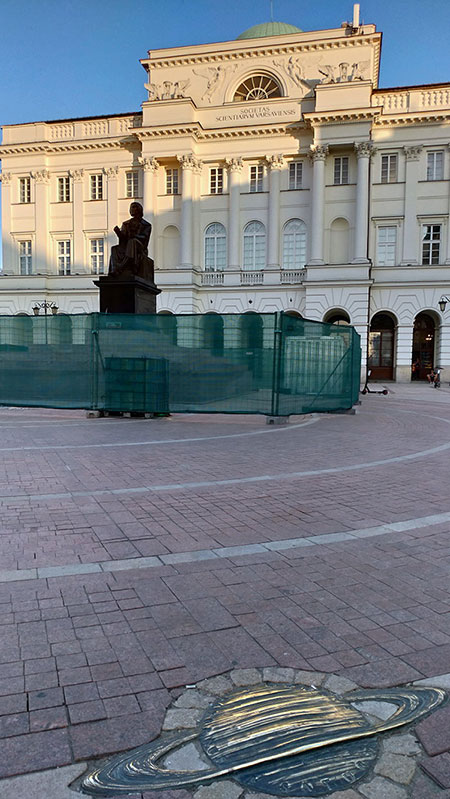 雕像的大理石基座的西面則有波蘭文刻字:「Mikolajowi Kopernikowi Rodacy(同胞送給 Mikolaj Kopernik)」,而 Mikolaj Kopernik 其實是哥白尼的波蘭文名。 波蘭科學院 (Polish Academy of Sciences) 總部,前身是史塔胥茨宮 (Staszic Palace),建於 19 世紀,建築新古典主義外牆氣勢不凡,由意大利建築師安東尼奧•科拉齊 (Antonio Corazzi) 所設計,1944年華沙起義幾乎被夷為平地,1946至1950年,重建並保持其原有的新古典主義的形式,現為波蘭國家科學院,成立於1951年,是波蘭頂級的學術機構。 波蘭科學院總部旁是與克拉科夫郊區街銜接的新世界街(ulica Nowy Świat),坐落於此的是扎莫斯基宮(Zamoyski Palace),初建於1667年,是一棟歷史悠久的建築。1839年,宮殿成為安德烈·阿圖爾·扎莫伊斯基的財產,委託建築師建築師恩里科·馬可尼( Enrico Marconi)領導重建工程,賦予了該建築現今的規模與外觀;華沙起義期間這座宮殿遭到破壞,在 1948 年至 1950 年間重建,目前宮殿為華沙大學所使用。  | | 返回聖十字教堂前細看路面工程進行。 |  | | 原來在重鋪地面石磚。 |  | 畢蘇茨基廣場(Piłsudski Square)前立有約瑟夫·畢蘇斯基 (Józef Pi?sudski)雕像,他是波蘭最偉大的愛國者與政治家,一生中不同時刻擔任過波蘭國家元首、波蘭元帥和波蘭總理。這尊雕像由雕塑家塔德烏什•沃賈內 (Tadeusz Łodziany) 所設計,刻畫著畢蘇斯基雙手交扣握住他的劍,人物身材高大,微微頷首,目光堅毅,低頭沉思;雕像於 1995 年落成揭幕。 畢蘇茨基廣場(Piłsudski Square),在納粹佔領期間名為阿道夫·希特勒廣場 (Adolf Hitler Platz),在之後的共產黨統治期間又更名為勝利廣場 (Victory Square),而現在的名稱,則是用以紀念於 1918 年帶領波蘭走向獨立的約瑟夫·畢蘇斯基 (Józef Pi?sudski),是波蘭首都最大的廣場。 眺望畢蘇斯基廣場南側:現代建築風格的5星級飯店Sofitel Warsaw Victoria,其後為古典建築元素的扎切塔國家美術館(Zachęta National Gallery of Art)和聖三一教堂(Church of the Holy Trinity)的巨大穹頂,更遠處是科學文化宮(Palace of Culture and Science)高聳的尖塔。 大十字架紀念碑(Cross-monument),大理石製十字架,高達9公尺。這是教宗若望保祿二世在1978年晉升為羅馬教皇後,1979年對波蘭祖國的首次訪問,在廣場上舉行露天的慶祝神聖彌撒聖彌撒,為了紀念這件事,廣場上豎立起巨大的十字架,並勒石銘記。 一條金色的中軸線穿越畢蘇斯基廣場,連結約瑟夫·畢蘇斯基雕像與華沙無名烈士墓。