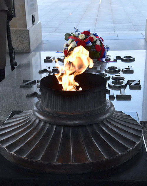 | | 華沙無名烈士墓正前方與正後方。 |  | 華沙無名烈士墓內長年燃著不滅的聖火,代表了人們對永久和平的渴望。 無名烈士墓的左右兩側有兩個身穿禮儀服裝的士兵守衛著,每一小時衛兵們會換一次崗,這種已成固定模式的換崗儀式,也是華沙觀光的重要噱頭之一。交接儀式非常簡單:先由墓內守衛士兵走出來。