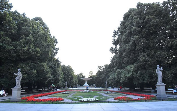 華沙無名烈士墓後是佔地15公頃的撒克遜花園(Saxon Gardens),是華沙最老的公共公園,在1727年開放,也是當時世界最早可以自由進出的公共公園空間;撒克遜花園原以法式庭園設計,19世紀改為英式庭園,在二次大戰遭到毀壞後重建。從無名烈士墓進入撒克遜公園正門,正對一座噴泉水池,花壇綠地兩旁是波蘭著名歷史人物的大理石雕像和高大繁茂的樹叢。 撒克遜花園噴泉眺望華沙無名烈士墓與畢蘇斯基廣場。