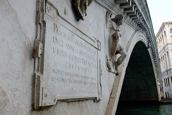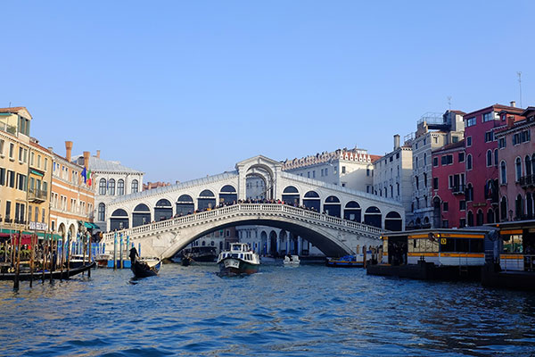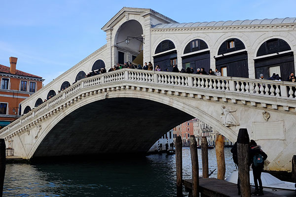 「里阿爾托橋」Ponte di Rialto是「大運河」上四座橋裡最老的一座,也是最出名的一座。現在這座石造的版本是1591年由建築師Antonio da Ponte所設計的,之前的幾座木造橋都因為承受不住人潮的重量而垮了(驚)。新橋落成之時正值文藝復興的極盛時期,據說米開朗基羅原先也在被考慮的建築師名單上。這座橋所連結的「里阿爾托市場」Mercato di Rialto一帶的觀光客人潮相當多,「里阿爾托橋」本身也是威尼斯最出名的觀光景點之一。這座地標甚至在世界各地還有分身。你在拉斯維加斯或是澳門的「威尼斯人旅館」外看到的那座橋就是它。 「里阿爾托橋」Ponte di Rialto。 這座在1591年由建築師Antonio da Ponte設計重建的橋是「大運河」上最老的橋。