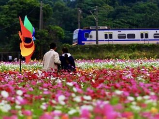 花海控快衝!嘉義民雄「波斯菊花田」盛開 列車同框美景太夢幻