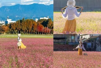冬季想找個療癒系景點?台中新社「後溪底福德祠」近期以粉白相間的蕎麥花海再度爆紅!大片花田在陽光下輕輕搖曳,如同撒落在田野間的柔光濾鏡,而一旁的落羽松逐漸轉為金橘與赤紅,形成宛如大自然調色盤的夢幻畫面,吸引許多攝影迷、情侶與親子旅客專程前往