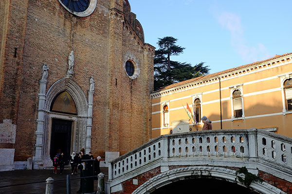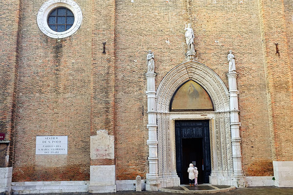 這座「聖方濟會榮耀聖母教堂」The Basilica di Santa Maria Gloriosa dei Frari常被簡稱為Basilica dei Frari(義大利教堂的名字長到連義大利人自己都會怕),是座從小教堂「長大」的教堂。它打從1231年開始就在這個位置有座教堂,然後在往後的2個世紀裡這裡加蓋了禮拜堂,那裡加蓋了鐘塔,拆了這裡蓋了那裡,到了1492年定型成當今模樣的時候教堂已經被改得連大門的位置都被調頭了,成為現在大門面對著一條小運河的格局。