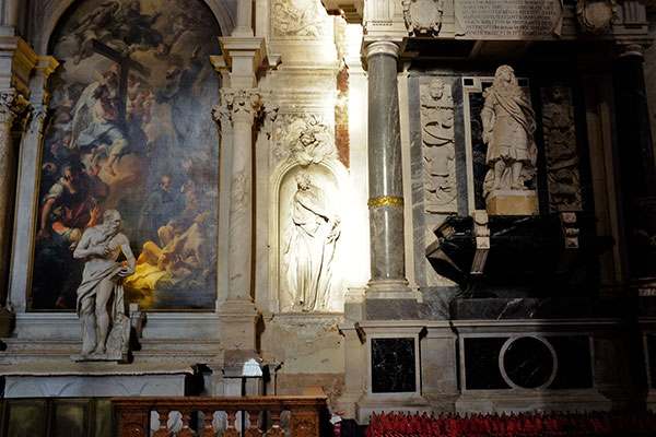 教堂的側門上是1669年獻給總督Giovanni Pesaro的一座巴洛克風格紀念碑。