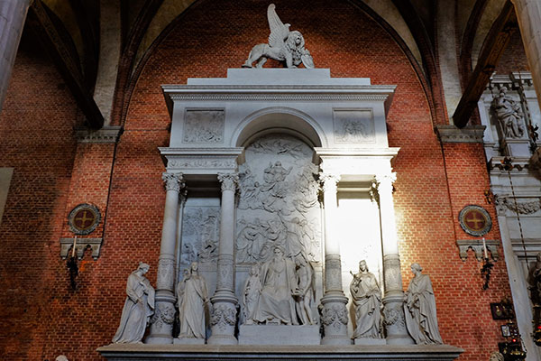 環繞在教堂大廳裡的便是這些名人之墓和紀念陵寢。這是義大利雕刻家Antonio Canova (1757年-1822年)的紀念陵寢。它的設計圖樣其實原是Antonio Canova在1794年受託為提香Tiziano Vecellio (Titian)設計的紀念陵寢,但是拿破崙在3年後的1797年入侵威尼斯,終結了「威尼斯共合國」Republic of Venice,案子也就不了了之。Antonio Canova死後他的學生拿Antonio Canova的設計圖樣幫Antonio Canova打造了他自己的紀念陵寢。這座金字塔型的紀念陵寢在教堂裡還蠻突出的,只不過在設計中那個門是打開的有點恐怖就是了。這座陵寢中其實只有Antonio Canova的一顆心。人怕出名豬怕肥,Antonio Canova死後太搶手了,他的右手目前保存在「威尼斯美術學院」Accademia di Belle Arti裡,其餘的身體下葬在他故鄉Possagno中由他自己設計的Tempio Canoviano之中。是說再出名也不用這樣一個人分葬在三個地方吧!